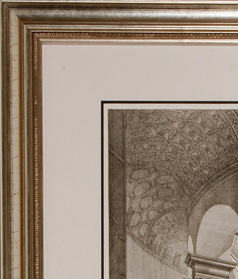 This 18th century Piranesi etching is presented on an antiqued silver-colored wood frame with a light tan mat and a thin black inner mat trim. The frame measures 27" high, 32" wide and 1.5" deep. There is a vertical center fold, as issued. The print is in very good condition.